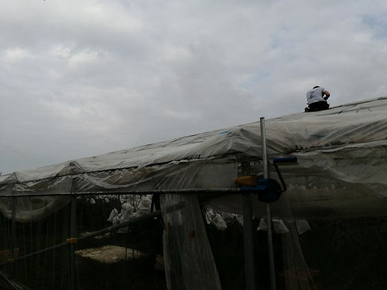 5月24日(金) ![]() 袋かけを終えたハウスから順番にビニールを巻上げていきました。 まず最初は第二マンゴーハウス2棟と平張り部分から。 二人がかりでスプリング外しから始めてビニール巻き上げ、 頂部固定からの仕上げのハウスバンド固定まで2時間で完了! 明日は第一マンゴーハウス2棟のビニール巻き上げ予定です。 |