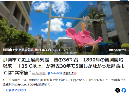 7月19日(金) ![]() ![]() 空の青さが濃くなっている気がする。 暑さで空気が薄くなっているのを実感。 これまで味わったことのない日差しの強さだと感じていたけど、 那覇市で史上最高気温を記録したそうだ。 この暑さだと来週接近する台風はヤバい台風になるかもしれない。 いつもよりも時間をかけて台風対策実施中です。 |