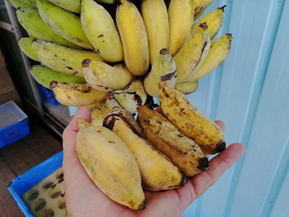 7月31日(水) ![]() 無農薬栽培はやっぱ難しいね。 ゴーヤーにはウリハムシやカメムシが寄ってきて悪さしまくり。 収量が上がらないのでそろそろ撤去かな。 かわりに真上に伸びているペトレアを誘引、 棚に這わせて花を楽しみたいと思います。 ![]() ひと房で80個以上かな、1〜2個食べただけで腹いっぱい... 一人じゃ食いきれないことがわかったので友人知人にお裾分けすることにしました。 10個単位で配り手元に残ったのは20個くらい、 一人で食べるにはちょうどいいくらいだな。 この量のバナナが来月から次々と収穫できる予定。 もっちりナムワーバナナ、来月から直売所での販売決定です(たぶん)。 |