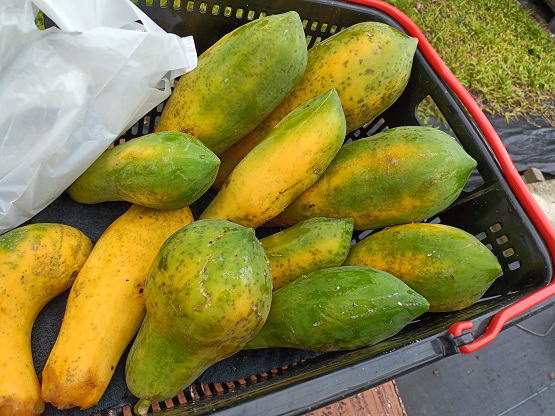 2月17日(月) ![]() 久々の青空と日差しに癒されています。 今日のマンゴーハウス内は人にとってちょうどいい暖かさです。 お昼休憩、マンゴーハウス内、サマーベッドで横になる、最高です! ![]() 最近のマイブーム、フルーツパパイヤを収穫しました。 フルーツパパイヤは好き嫌いの好みは分かれるし品種によって味が大違いだけど、 冬場に出回るフルーツの中ではまあまあ美味しい部類に入ると僕的には思っています。 少量なら持ち帰って自家消費にしたいところだけど、 この量はさすがに食えないのでファーマーズマーケット行になります。 |