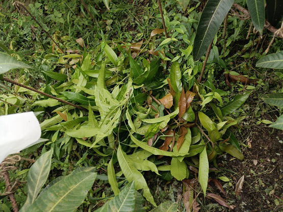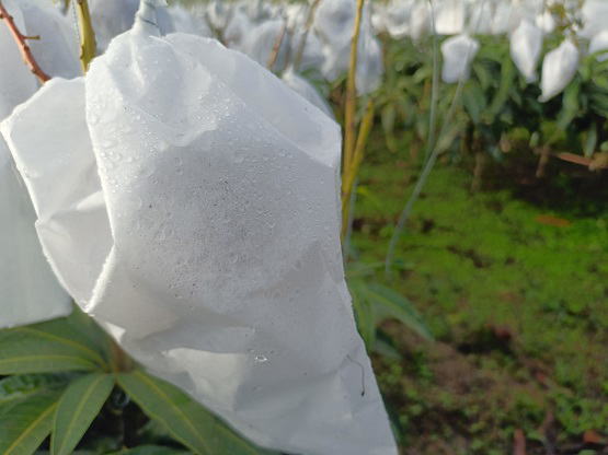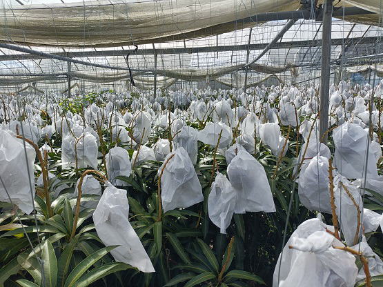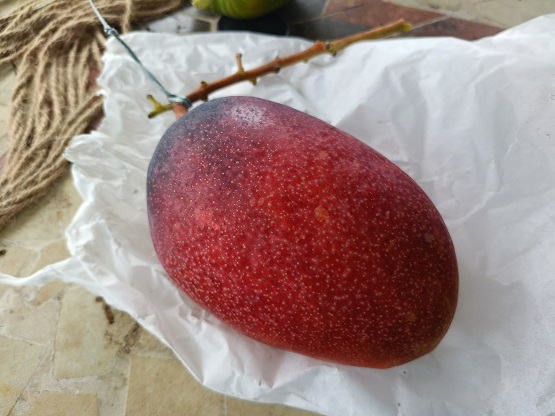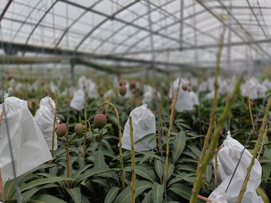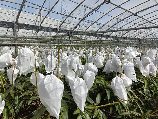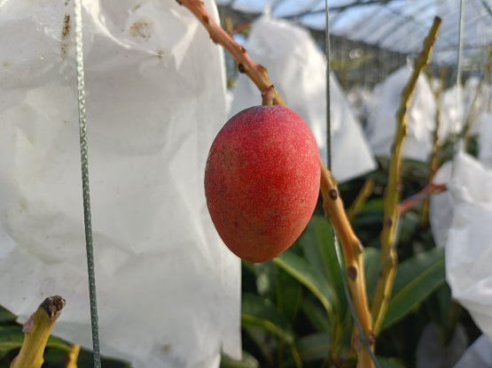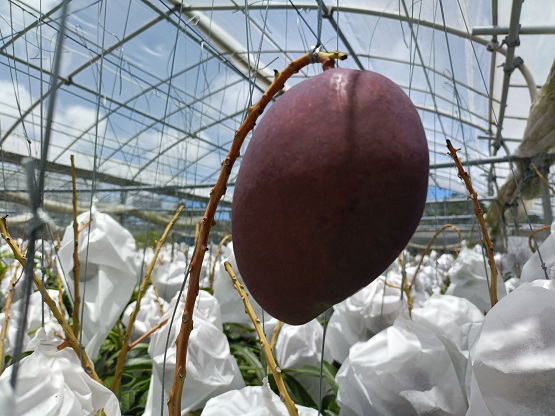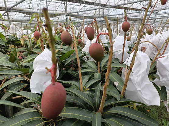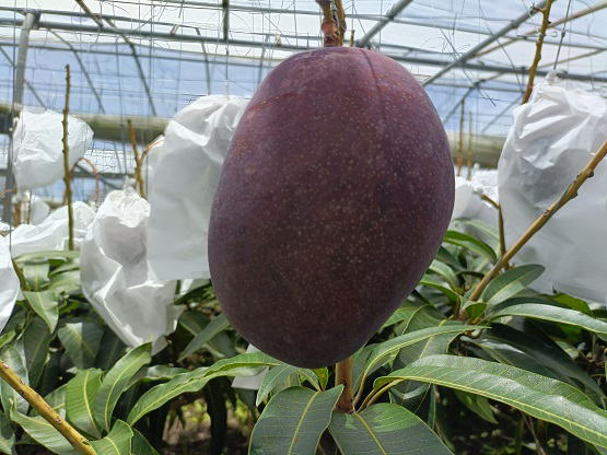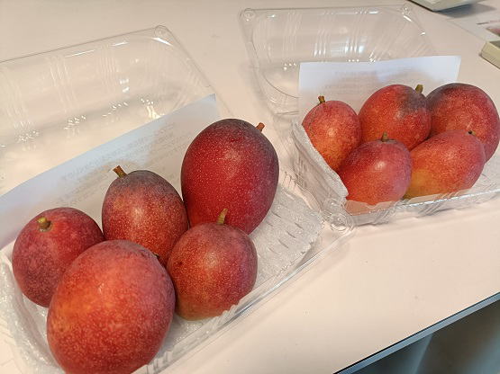 6月20日(金) ![]() 日中の暑い時間帯を避けて早朝6時から作業をしていますが、 昼夜の寒暖差のせいか葉や袋が水滴で湿っています。 ハウス内を少し移動しただけで服がずぶ濡れ状態です。 日中の強い日差しとずぶ濡れどっちがマシか... 不快だけどまだずぶ濡れの方がマシかな。 ![]() ずぶ濡れになりながら作業をしていたら、 うっすら赤みを帯びた袋を発見しました。 袋を開けてみると赤く熟したミニマンゴーでした。 予想よりちょっと早め、今シーズン第一号の収穫です! |