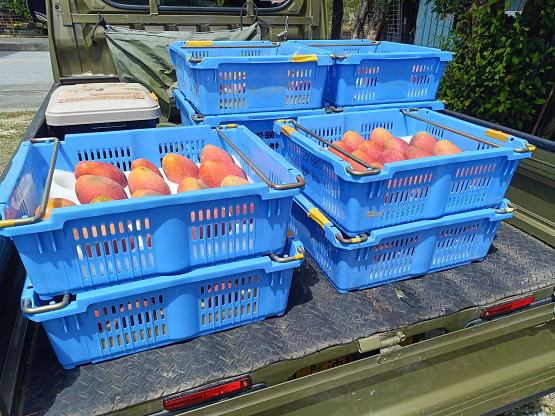 7月20日(日) ![]() 今年のマンゴーは大玉傾向です。 マンゴーをめいっぱい詰めると一コンテナで10キロ以上はありそうです。 持ち上げるたびに傷跡が若干痛みます。 体には優しくないけど嬉しい重みです。 |