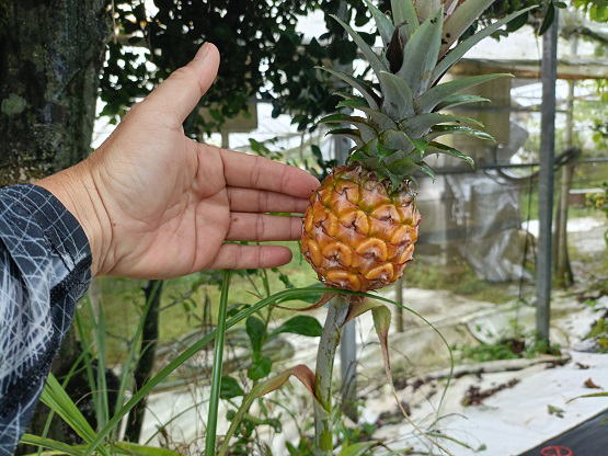 7月26日(土) ![]() 7月中旬頃から雨の降らない日はありません。 それどころか日に日に雨量が増えてきて、ここ数日は豪雨が続いています。 2か月遅れの梅雨って感じです。 マンゴーの書き入れ時ってのにFMでの売れ行きに影響が出ています。 ![]() 鉢植え栽培のパイナップルが熟しました。 ただ大きさが不満で指4本分しかありません。 肥料なし、潅水時々、ほったらかし栽培だから仕方ないかな。 ろくに管理をしてないので実っただけ良しとするべきだね。 |