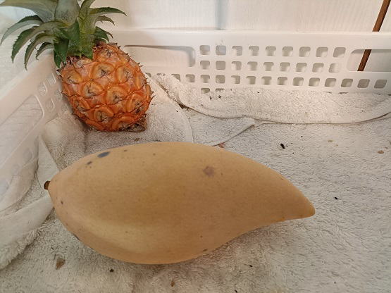 ![]() おそらく風でしょう。 バナナにかけていたカバー外れていました。 おかげでバナナは汚れ気味です 見栄えが悪くなったのでFMで安く販売します。 ![]() ポトリ果しているのに気付かなかったナムドクマイマンゴーです。 タンソがいたるところに発生していて売り物にはならないので自分用にします。 |
