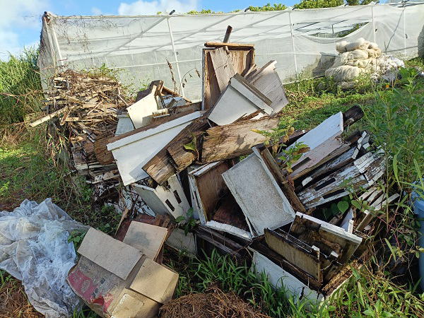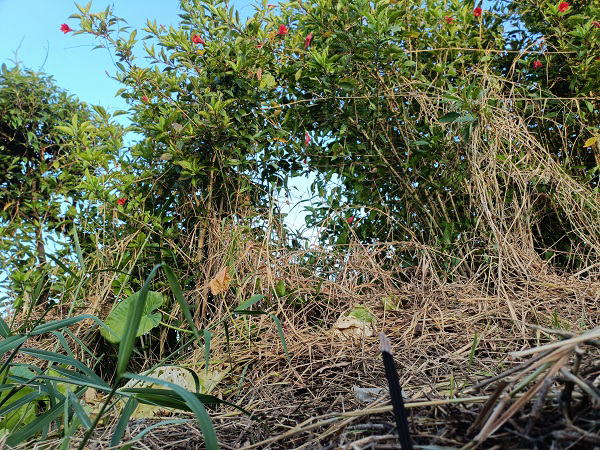 8月29日(金) ![]() ハウス内の一番奥の角、まだヒモ取りを終えていない箇所がすごいことになっていた。 蔓性雑草が吊り紐をつたって上へと伸びまくっている。 無理に引きちぎるとマンゴーの新芽まで折ってしまうことになる。 慎重に一本ずつほどいていかないといけない。 また面倒な作業が増えてしまったよ... ![]() まだ残っていたよ、負の遺産が。 マンゴーハウス内を歩いていたら尖った鉄筋が靴底に軽く刺さってしまった。 色が土と同化していて一時でもその場を離れようものなら見失ってしまうので 即対応、掘り起こして即撤去した。 |