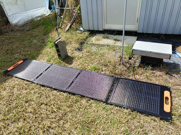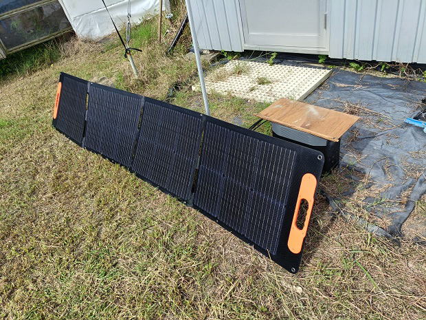 9月25日(木) ![]() ![]() 試験圃場の散水用電源取りに大活躍! ポータブル電源の太陽光充電をしました。 朝は東の空に向け、お昼は地べたに這わす、 パネルを太陽に向けることで充電量大幅アップです。 |