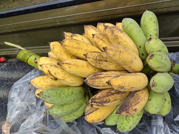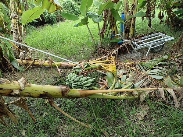 9月26日(金) ![]() もっちりバナナ(ナムワー)を収穫しました。 直径20pで高さ4m以上のバナナの木から、 これまた2.5mの位置に着いている重さ20キロ近くあるバナナを収穫するのは危険がいっぱい。 細心の注意を払いながら突っ張り棒をうまく利用しゆっくりと切り倒していった。 今回はケガなく収穫できたが今後のことを考えると 安全で楽に収穫できる方法を考えなければいけないな。 ![]() 2個セットでファーマーズへ納品した。 午後納品にもかかわらずほぼ完売した。 ![]() ↑お裾分け用 明日納品分のバナナを仕分けしていった。 20セットは作れそうだ。 傷有りは友人知人へお裾分けします。 |
