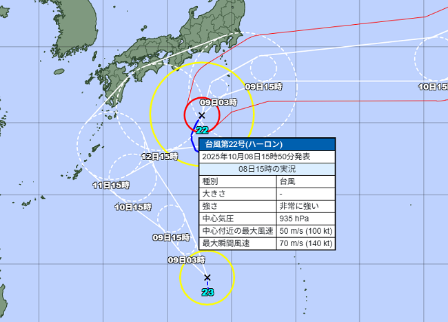 10月8日(水) ![]() ポットで育てていたメロンとホオズキを定植しました 前もって土作りをしていたにもかかわらず ここ数週間の強烈直射日光で土がかなり固くなっていました なのでスコップでほぐし直してからの定植です ![]() 一時は沖縄本島直撃コースの予報だった台風22号 最大瞬間風速70mまで発達してるのが恐ろしいところ Uターンして本州に上陸かと思われたが、なんとか反れてくれそうだ 10/8 20時追記: 八丈島、特に青ヶ島は台風の進路的にすごく危険 頑丈な建物に避難をして命を守る行動をしてもらいたい 22号の後追いになる台風23号は風速が弱い予想 こちらは台風対策をしっかりやれば大きな被害を出すことはないだろう |