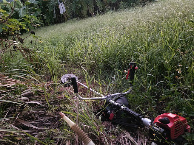10月7日(火) ![]() チビアシナガバチが飛んでいるのを見かけたら追いかける。 そしたら高確率で巣を発見できる。 巣を確認出来たら可哀そうだが駆除する。 マンゴーハウス内でのチビアシナガバチとの戦いは今月も続きそうです。 ![]() 草刈機にワイヤー刃を着けてマンゴーハウス内の草刈をしました。 鉄刃タイプだと刈り取った雑草が山積みで残るが、 ワイヤー刃だと粉々になって跡形もなくなるのが気持ちいいです。 |