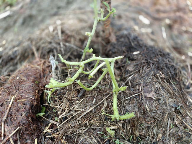 10月10日(金) ![]() ![]() バナナが次々と自重と実の重みで倒れています。 突っ張り棒を入れても重さのかかっている位置から折れる始末です。 倒木したバナナの木を片付けるのが バナナ栽培メインの仕事になっています。 バナナの栽培管理...万策尽きたって感じです。 ![]() 植付翌日に萎れてしまったメロン、 緊急でたっぷり目に水やりをした結果、復活しました。 もう一日水遣りが遅れていたら確実に枯れていただろう。 何者かにかじられた痕跡もあるし、 しばらくは毎日の見回りが必要なようです。 |