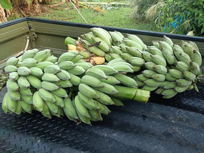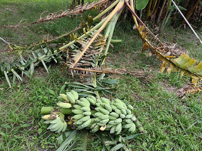 11月20日(木) ![]() ![]() バナナ園では2種類のバナナを育てている。 アップルバナナにアイスクリームバナナだ。 バナナ園を見回りすると1本の木がバナナの重みで倒木していた。 収穫期をむかえたアイスクリームバナナだった。 前回収穫したアップルバナナが明日にでも熟しそうなので、 アップルとアイスクリームを直接食べ比べしたいと思う。 |