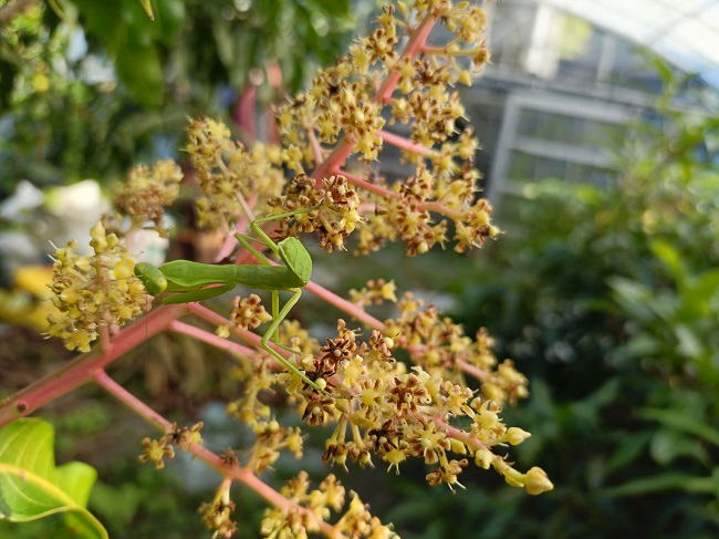 11月7日(金) ![]() 狂い咲きしたマンゴーの花にカマキリを発見。 これじゃ受粉昆虫が近寄れないのでカマキリを捕まえて近くの木に移動した。 減農薬栽培をしているといつの間にかハウス内では生態系が生まれ、 マンゴーに悪さをする害虫を捕食するカマキリやクモが増えてくる。 なので僕はギリギリまで殺虫剤の散布をしない。 |