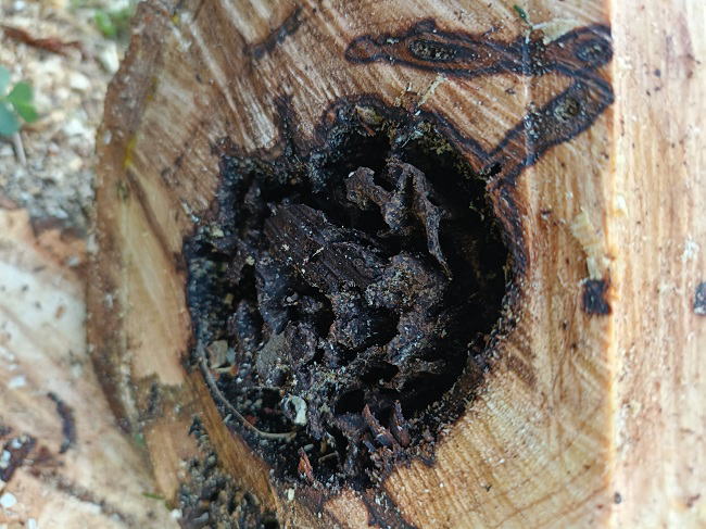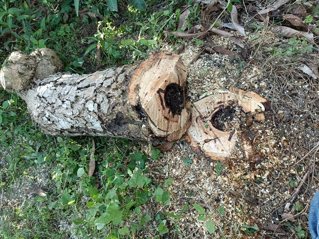 12月4日(木) ![]() ![]() 枯れもしないが生長もしない、 何年も前からこの調子だから実が着いても数える程度。 原因はわかっていたが治療する方法がないので切り倒すことにした。 幹の中は予想通りの状態で、おまけに白アリまで巣くっていたよ。 愛着はあるけど周囲の木々、作業に影響があり、 もうこれ以上ほおってはおけない。 30年以上も一緒に頑張ってくれたことに感謝しながら、切り倒し完了です。 |