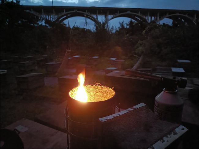 12月31日(水) ![]() 12月末時点の群数 395〇3 計398 残念ながら400群に一歩届かず 年間採蜜量 春102キロ 冬230キロ 計332キロ 300キロ超えなので及第点 いつか1000キロしぼるのが目標 ![]() 12/31〜1/1 各蜂場から集めた古箱 無煙竹炭器2台体制で焼却処分 |