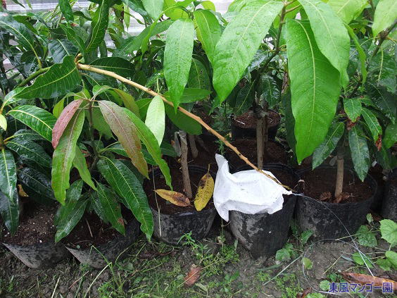 2011年2月25日 花芽を確認 前年に接ぎ木をしたマンゴーの苗に花芽がきました。 実際は接ぎ木をしてまだ一年たっていません。 本当なら花芽を折り、枝数を増やしたほうがいいのですが折角なので記録用にそのまま花芽を育てて収穫までチャレンジしてみたいと思います。 |