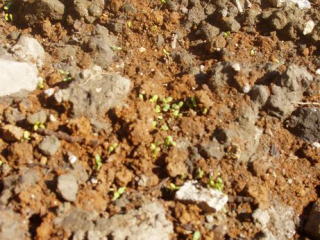 2008年12月24日(播種13日目) 早くも芽が密集してしまった>< 種を蒔くとき広範囲にばら撒いたつもりだったのに・・・ 間引きしなきゃ。 |
